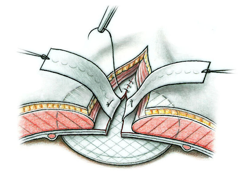 Bei kleinen Nabelhernien unter 2 cm und normalgewichtigem Patienten wird die Bruchlücke mit fortlaufender, nichtresorbierbarer Naht verschlossen. Der Hautschnitt liegt kosmetisch günstig am unteren Nabelrand.