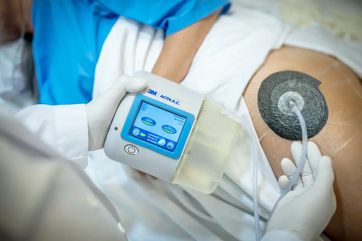 Eine besondere Therapie ist die sogenannte Vakuumtherapie (VAC / Unterdruck-Wundtherapie) der Firma Solventum. Dabei wird mit einem leichten Unterdruck die Wundflüssigkeit abgesaugt, Bakterien reduziert und die Neubildung von gesundem Gewebe gefördert. Das unterstützt die Heilung und kann die Dauer bis zum Wundverschluss verkürzen.