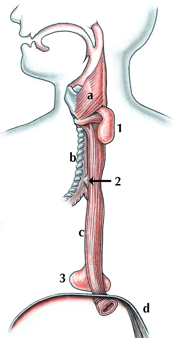 - Pulsionsdivertikel: Die häufigste Form ist das Zenker-Divertikel. Genau genommen handelt es sich dabei nicht um ein Divertikel des Ösophagus, sondern eher des Schlundes (Hypopharynx). Als mögliche Ursache wird ein muskelschwaches Dreieck hinten am Übergang des Schlundes in die Speiseröhre angenommen. Bei der Entstehung des Divertikels spielt wahrscheinlich eine Funktionsstörung des oberen Speiseröhrensphinkters (Ösophagusmund) eine ausschlaggebende Rolle. Eine weitere Theorie besagt, dass ein Teil des oberen Speiseröhrensphinkters (Musculus constrictor pharyngis inferior) derart stark wird, dass die Nahrung eher in das Divertikel als in die Speiseröhre rutscht und die Speiseröhre durch das grösser werdende Divertikel zunehmend abgedrückt wird.