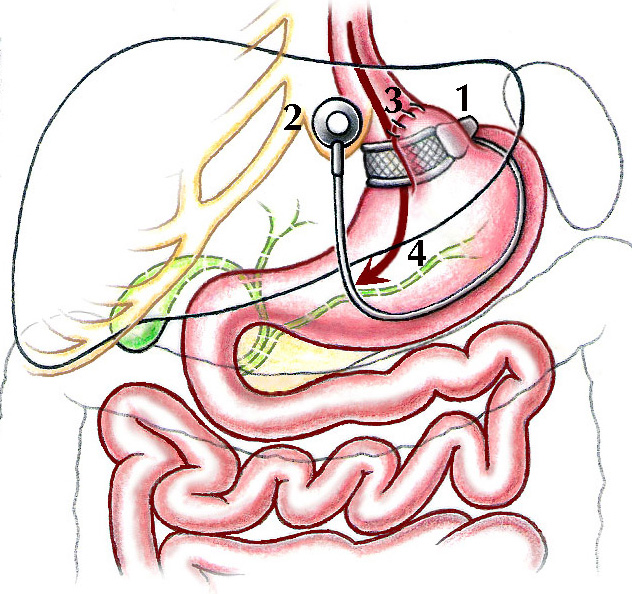 Seit wenigen Jahren ist ein so genannter Magenschrittmacher auf dem Markt, der laparoskopisch implantiert werden kann. Die Elektroden werden im Bereiche des Antrums angelegt, der Schrittmacher kommt unter der Haut zu liegen. Die Resultate sind allerdings nicht sehr erfolgreicherfolgversprechend, zumal der Gewichtsverlust limitiert ist. Auch werden die Kosten dieser Therapie von der Krankenkasse nicht übernommen, was den Patienten teuer zu stehen kommt.
