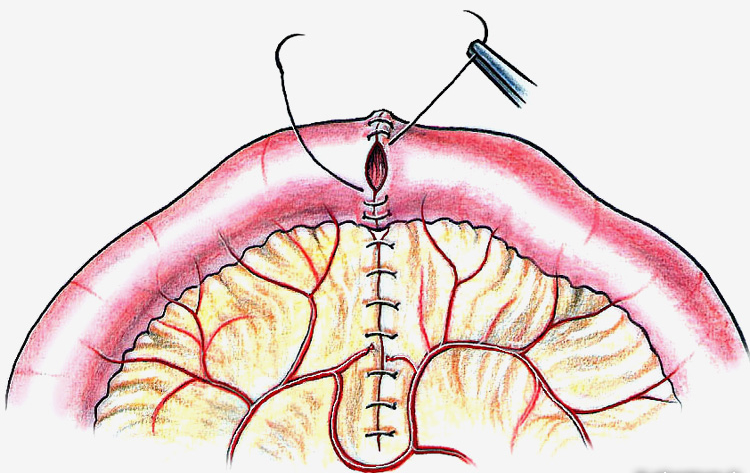 Wichtig ist am Schluss die Vernähung der Darmwurzellücke zur Verhinderung einer inneren Hernie. Dabei kann eine andere Darmschlinge durch die Lücke schlüpfen und durch Einklemmung einen Darmverschluss verursachen. Der genähte Darm wird zurückgelegt und die Minilaparotomie schichtweise verschlossen. Die kleinen Hautinzisionen müssen lediglich mittels Hautnaht verschlossen werden.