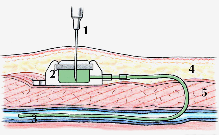 Nach Setzen der Lokalanästhesie wird die Haut im Bereich der Vorderseite der rechten Schulter eingeschnitten und die Vena cephalica wird aufgesucht und dargestellt. Der Katheter des Port-a-Cath wird durch eine kleine Öffnung in die Vene eingeführt und unter Röntgenkontrolle bis in die obere Hohlvene vorgeschoben. Nach Fixation des Katheters mit einer resorbierbaren (selbstauflösenden) Naht wird der Schlauch mit dem Port verbunden. Das System wird auf Durchgängigkeit und seine Funktion überprüft. Anschliessend wird es mit einer Heparin-Lösung (blutgerinnendes Medikament) gefüllt, um einer Thrombosierung (Verschluss durch ein Blutgerinnsel) des Katheters vorzubeugen. Das Reservoir wird schliesslich in einer subkutanen Tasche auf dem grossen Brustmuskel mit nicht resorbierbaren Nähten fixiert. Zum Verschluss der Haut werden spezielle Fäden verwendet, die unter der Haut zu liegen kommen und sich mit der Zeit selbst auflösen. Die verschlossene Wunde wird mit einer Wundfolie abgedeckt, so dass der Patient absofort wieder duschen kann.