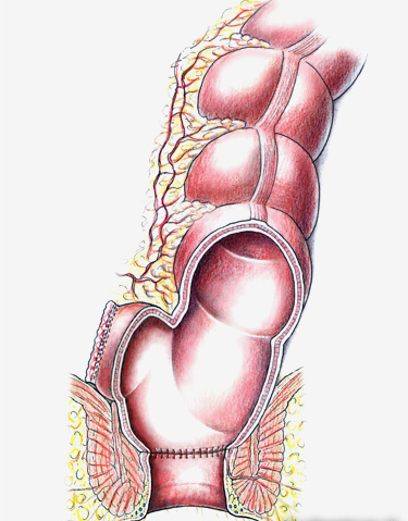 Diese Operation wird fast ausschliesslich bei chronisch-entzündlichen Darmerkrankungen (z.B. Colitis ulcerosa) durchgeführt. Dabei geht es um die Entfernung des gesamten Kolons und des Rektums, um die entzündliche Erkrankung des Darms zu stoppen und allfälligen Entartungen (Krebsgeschwülste) vorzubeugen resp. diese gerade zu entfernen. Um die natürliche Darm-Passage zu erhalten, kann nur der Dünndarm mit dem After wiedervereinigt werden. Der Dünndarm kann zur Bildung eines Ersatz-Enddarms oder Tasche (Pouch) verwendet werden, man spricht dabei von der ileo-analen Pouch-Anastomose.