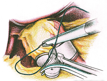 Das Reservoir wird unter die Haut eingepflanzt. Dafür braucht es einen etwas grösseren Hautschnitt über dem unteren Anteil des Brustbeins. Das Reservoir wird mit drei Fäden direkt am Brustbein befestigt. Die Fixation muss sehr gut halten, da es sonst bei beweglichem Reservoir zu einem Ermüdungsbruch des Silikon-Schlauches kommen kann. Am Schluss der Operation werden die kleinen Hautschnitte mit resorbierbaren Fäden vernäht, die sich unterhalb der Haut versteckt mit der Zeit selbst auflösen.