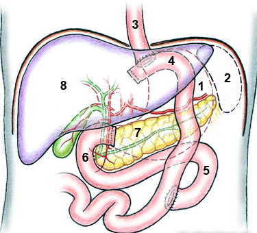 - Totale Gastrektomie: Bei grösseren oder am Mageneingang gelegenen Tumoren muss der ganze Magen entfernt werden. Bei dieser Operation wird auch die Milz mitentfernt werden. Wie bei der subtotalen Magenresektion ist es äusserst wichtig, die Lymphknoten neben dem Magen und in seiner Umgebung mitzuentfernen. Gelegentlich wird auch die Gallenblase entfernt. Zur Wiederherstellung der Darmpassage wird eine Dünndarmschlinge direkt an die Speiseröhre angenäht. Zur Verbesserung der Lebensqualität wird oft eine Magenersatzplastik mit dem Dünndarm hergestellt.