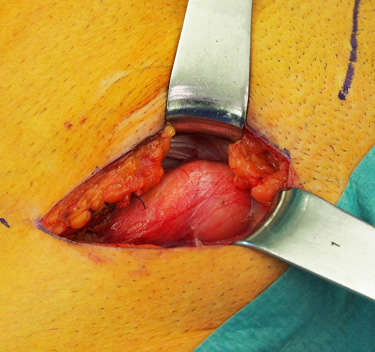 Bei der offenen Hernienoperation wird ein Hautschnitt angelegt. Nach Durchtrennung der ersten Muskelhaut (Faszie) wird die Hernie sichtbar.