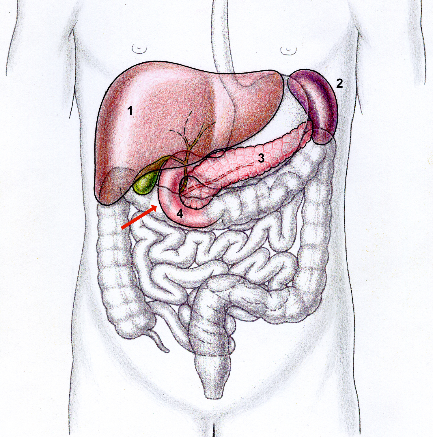 Der Zwölffingerdarm (Duodenum) stellt die Verbindung zwischen Magen und dem eigentlichen Dünndarm dar. Der Zwölffingerdarm liegt in nächster Nachbarschaft zur Leber, neben der Bauchspeicheldrüse und der Aorta sowie der unteren Hohlvene.